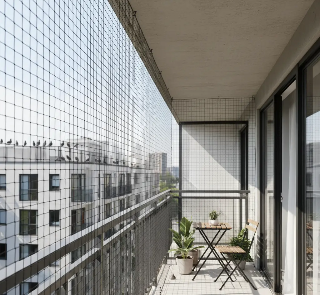 Pigeon Mesh Net: A durable, UV-stabilized polyethylene barrier used as a physical exclusion method to prevent pigeons from accessing balconies or ledges.